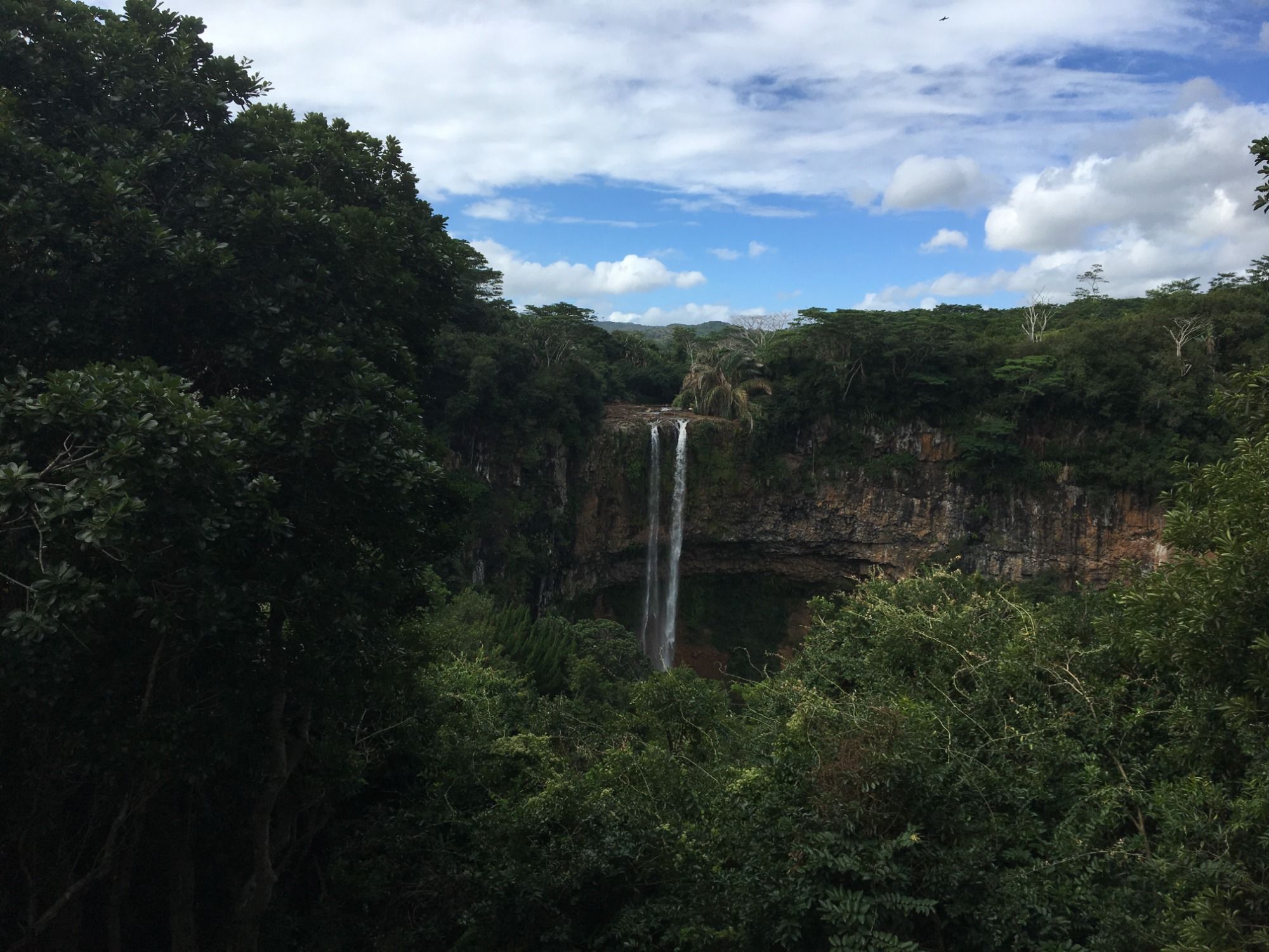 Per Taxi fahren wir eine Stunde durch die abwechslungsreiche Landschaft zum Wasserfall Chamarel. Vom Aussichtspunkt aus hat man eine schöne Sicht über den etwa 100 Meter hohen, einstufigen Wasserfall und das satte Grün der Vegetation drumherum. Farbenprächtige Blumen wachsen hier überall.