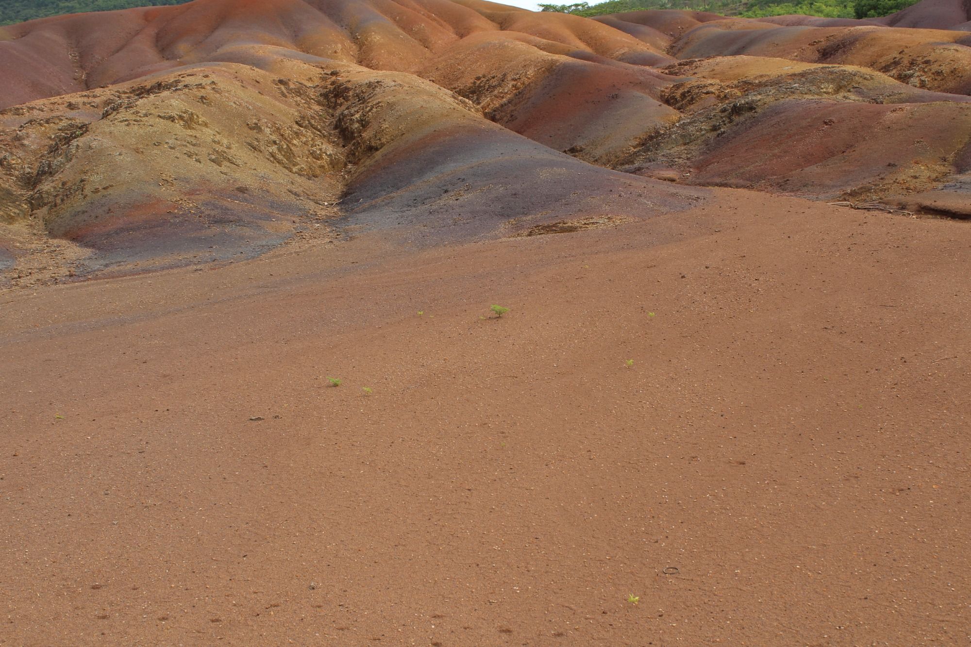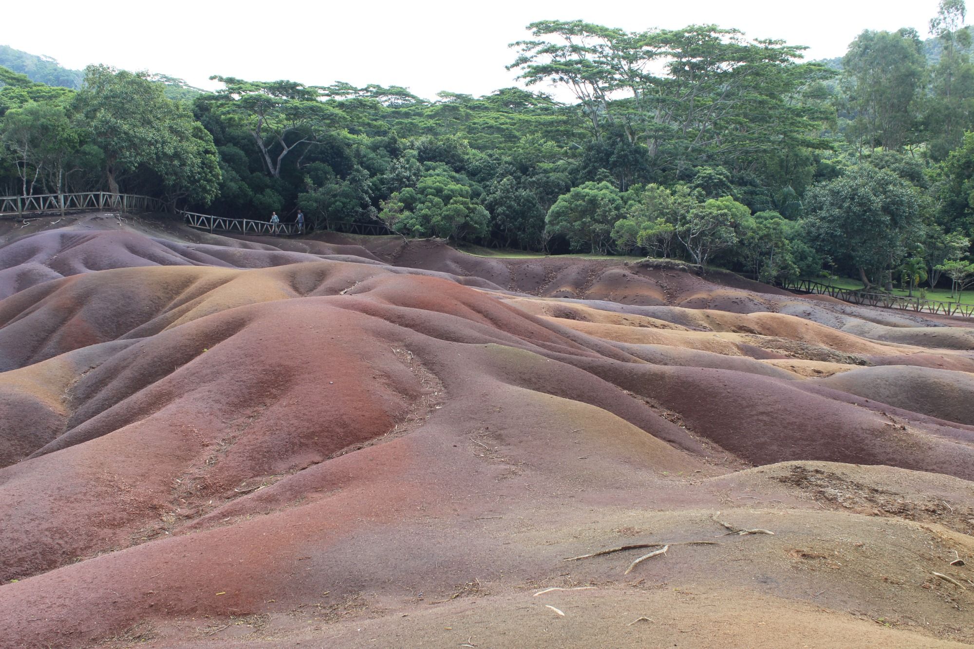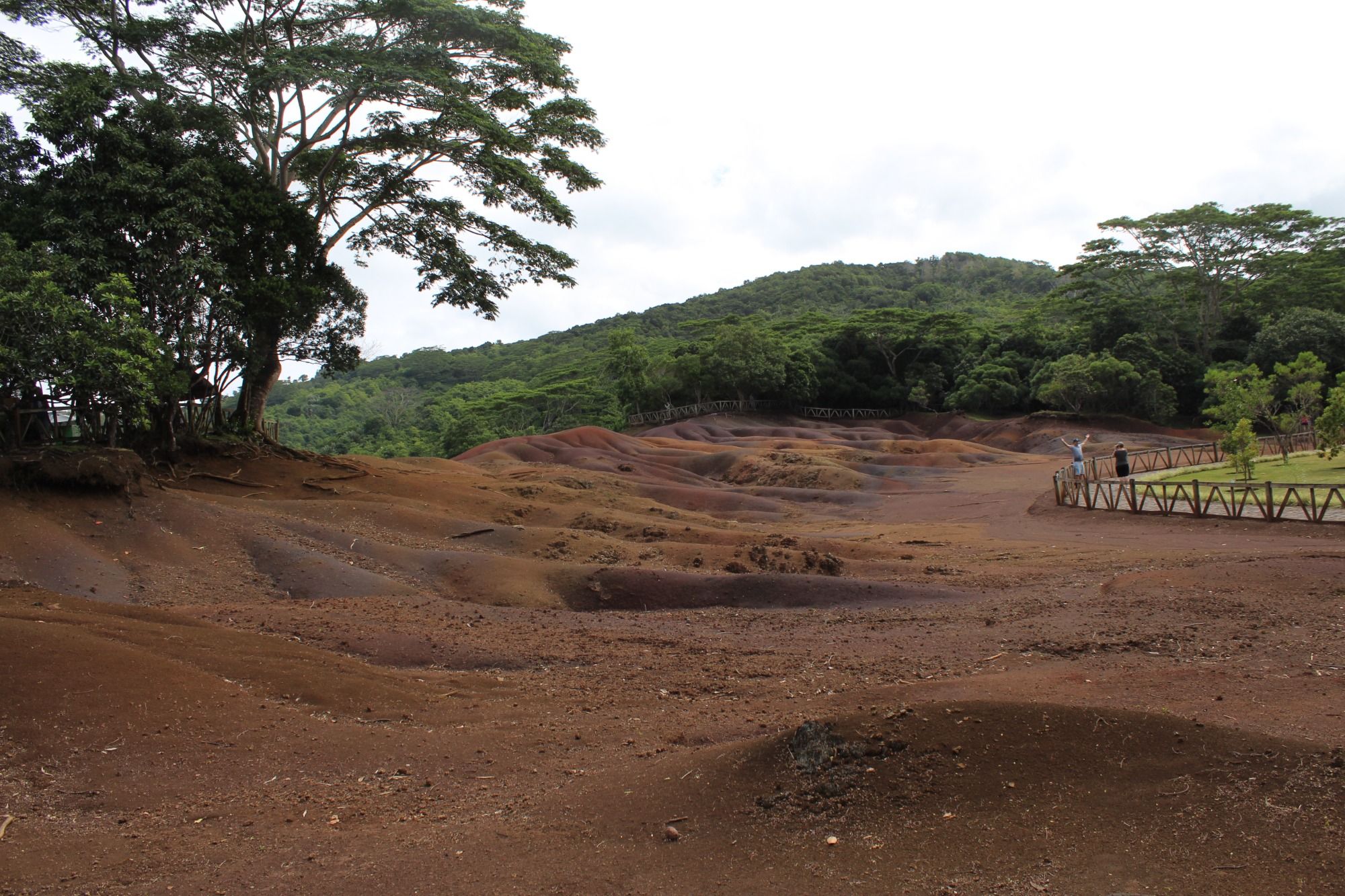 Ein paar Fahrminuten weiter erreichen wir schon unser zweites Ziel des Tages: die siebenfarbige Erde von Chamarel. Diese Erde ist ein Naturphänomen vulkanischen Ursprungs. Die Farben entstehen durch die Umwandlung von Basaltlava in Tonminerale und leuchten in den schönsten Rot-, Orange- und Lilatönen. Vor allem der grüne Hintergrund bietet einen schönen Kontrast. Hier gibt es auch ein paar Riesenschildkröten zu bestaunen.