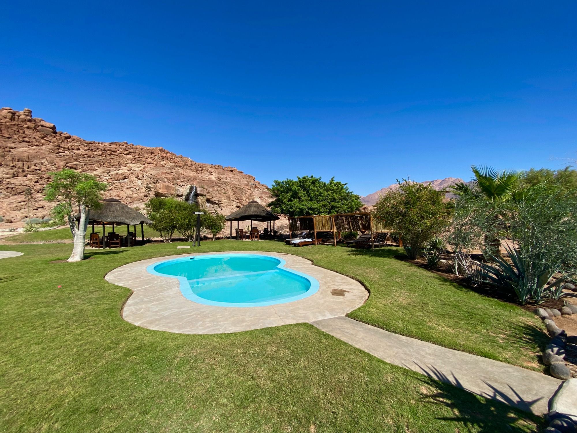 Nach einer staubigen Fahrt und vorbei an den typischen Rundhütten der Himba kommen wir am Brandberg an, dem höchsten Berg Namibias. Wir checken in der White Lady Lodge ein, kühlen uns im Pool der grünen Oase ab und suchen uns eine Campsite am scheinbar trockenen Flußbett aus. Dort entdecken wir sofort frische Spuren der Wüstenelefanten. Hier gibt es keinen Zaun oder ähnliches und so sind wir mal wieder wirklich mitten drin. Sogar die Duschen bieten einen freien, unverbauten Blick in den Sternenhimmel. Im Halbdunkeln lauft plötzlich eine Menschengruppe auf uns zu. Die netten Leute aus dem Dorf geben uns spontan ein kleines Konzert mit viel Rhythmus im Blut.