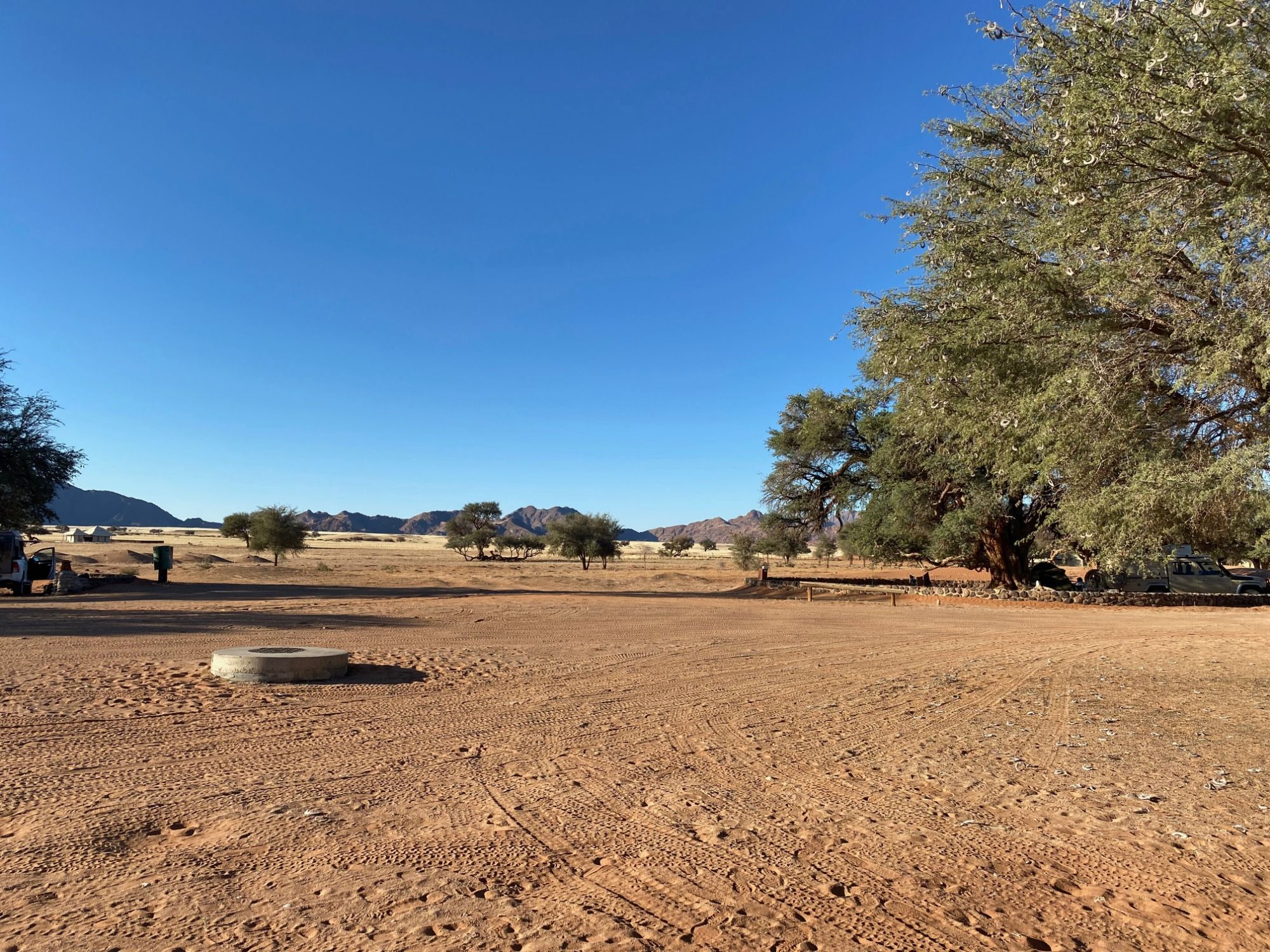in Highlight nach dem anderem erwartet uns in den folgenden Tagen rund um Sesriem. Allein die 350 Kilometer Anreise von Ost nach West sind landschaftlich sehr beeindruckend und lassen uns immer wieder staunend anhalten. Vor allem die Oryx-Herden haben es uns angetan. Unser Stellplatz direkt im Nationalpark ist traumhaft schön. Unter großen schattenspendenen Bäumen schlagen wir unser Lager auf und kühlen uns im Pool ab.