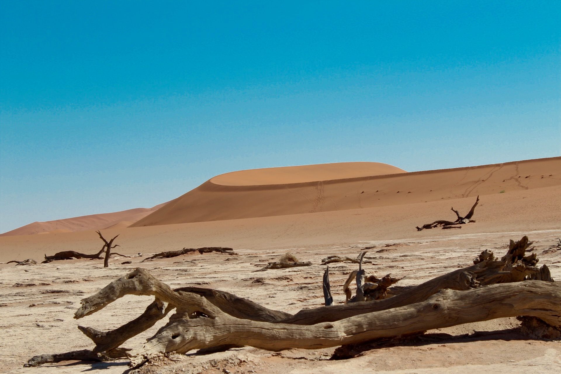 Direkt von der höchsten Düne der Welt springen und hüpfen wir die steile Sandwand hinunter ins Deadvlei. Über die ausgetrocknete Pfanne laufen wir danach barfuß auf die berühmten Baumskelette zu. Diese abgestorbenen Bäume sind in der trockenen Gegend hier seit vielen hundert Jahren konserviert. Wir können uns an den Farbkontrasten gar nicht satt sehen und wollen diesen mystischen Ort am liebsten gar nicht mehr verlassen.