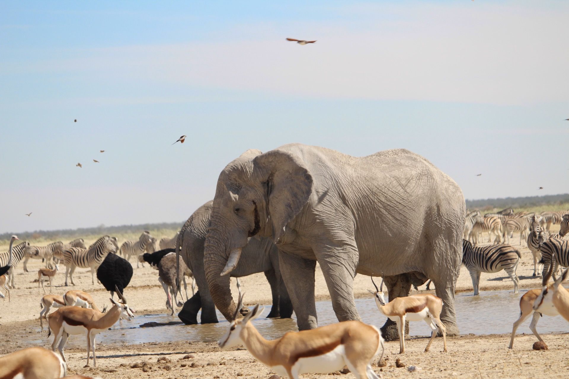 Über staubige Pisten gelangen wir tiefer in die Kalahari Wüste. Hier bleiben wir zwei Nächte um richtig anzukommen, die Gegend zu Fuß zu erkunden und auch mal am Pool der Lodge zu entspannen. Neben riesigen Nestern der Webervögel entdecken wir auf unseren Erkundundungstouren neugierige Erdhörnchen, viele Springböcke, flinke Warzenschweine und einen Hasen.