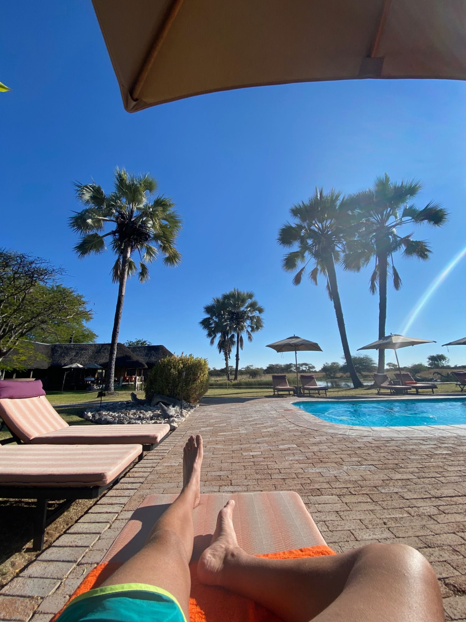 Direkt an den großen Nationalpark grenzt das private Reservat Onguma an. Hier verbringen wir zwei Nächte mit etwas Luxus: leckere Menüs direkt am Wasserloch, eine geführte Safari und ein großes weiches Bett in einer Hütte. Tagsüber kommen Kudu- und Zebraherden zum Trinken ans Wasserloch, während wir direkt nebenan am Pool relaxen. Der Sunset Game Drive mit unserem Ranger beschert uns unter anderem eine Löwensichtung, spannende Geschichten aus dem Alltag eines Rangers und ein schönes Picknick bei Sonnenuntergang.