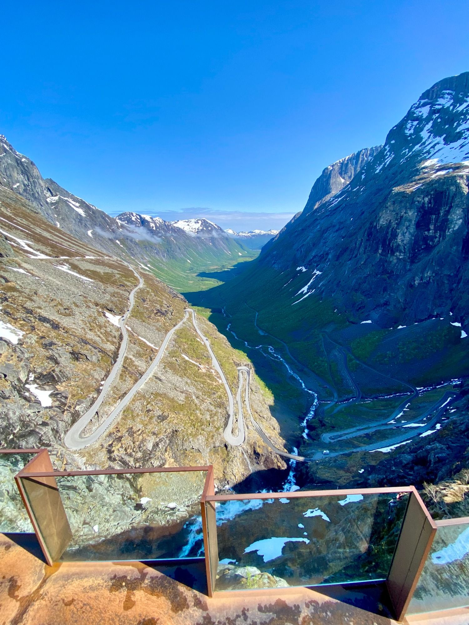 Trollstigen am Morgen vertreibt Kummer und Sorgen. Da diese beeindruckende Passstraße ganz kurz vor unserem Besuch nach dem Winterschlaf endlich wieder geöffnet wurde, fuhren wir also frühmorgens die elf Haarnadelkurven die steile Gebirgswand hinauf. Auf dem Trollstigplateau gibt es mehrere schöne Aussichtspunkte. Die größte Plattform ragt dabei sogar über die Kante und schwebt somit 200 Meter über dem Trollstigen. Beim Ausblick über die gigantische Schlucht kann man sich wirklich vorstellen, dass sich hier Trolle herumtreiben.