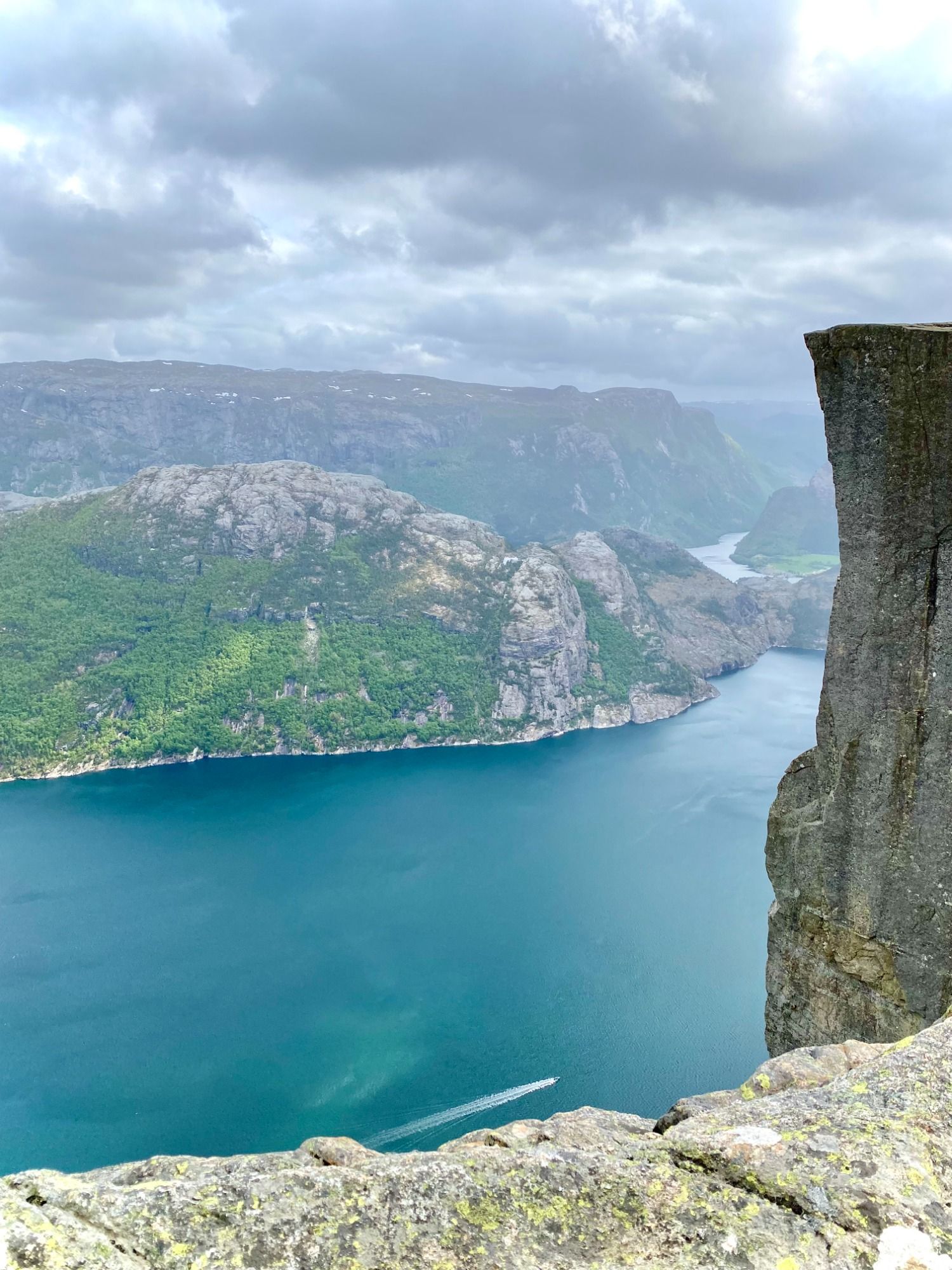 Eines der Highlights Südnorwegens bietet sich uns gleich am nächsten Tag: die Wanderung zum Preikestolen. Hin- und Rückweg ergeben acht Kilometer und vom Parkplatz bis zum natürlichen Felsplateau sind circa 340 Höhenmeter zu überwinden. Der Wind fegt gern über den 25 mal 25 Meter großen Felsvorsprung, aber der Ausblick über den Lysefjord und die umliegenden Berge entschädigt für die Strapazen.