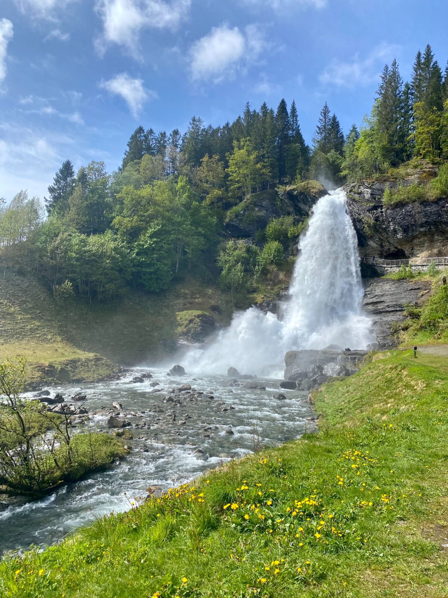 Einer der berühmtesten Wasserfälle Norwegens liegt in der Nähe des Hardangerfjords. Das besondere daran ist der Pfad, der hinter dem Wasserfall entlang führt. Einigermaßen trocken kommt man so an den tosenden Wassermassen vorbei.
