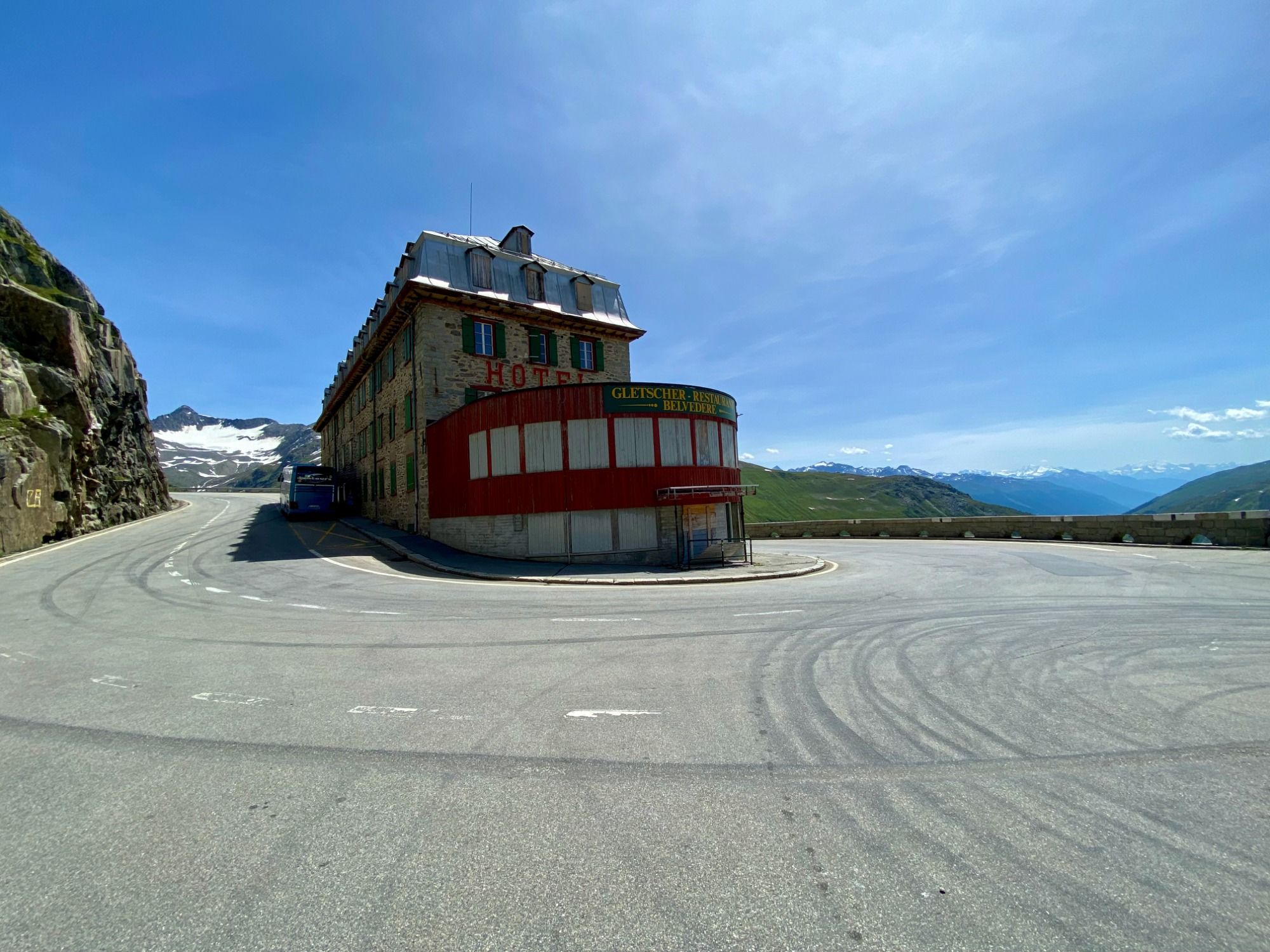 Unser letzter Alpenpass und gleichzeitig der höchste Punkt auf der `Grand Tour of Switzerland´ ist der Furkapass mit 2429 Metern ü.M.. Auf der anderen Seite fahren wir am ehemaligen Hotel Belvedere vorbei, welches am Rhonegletscher liegt.