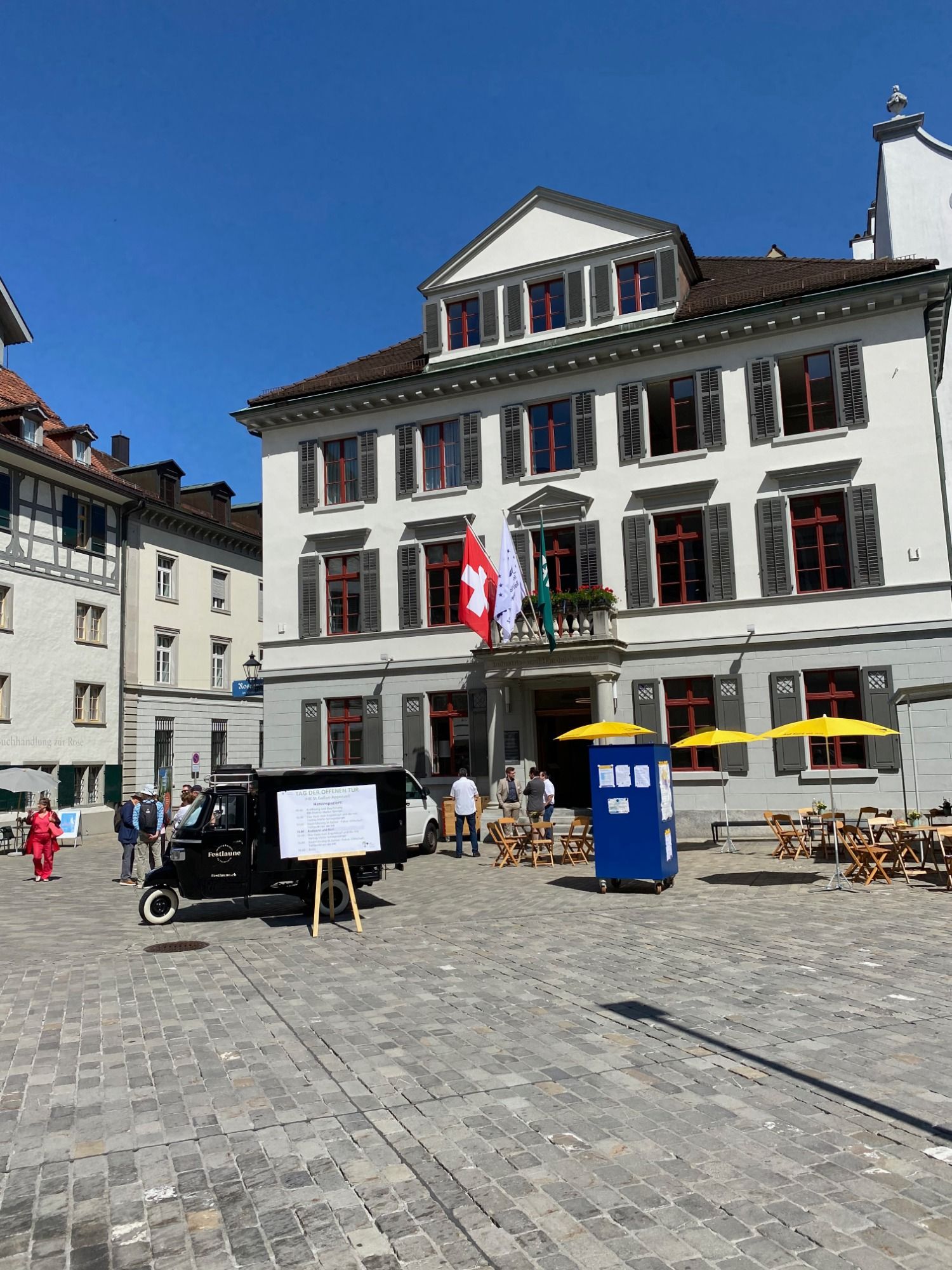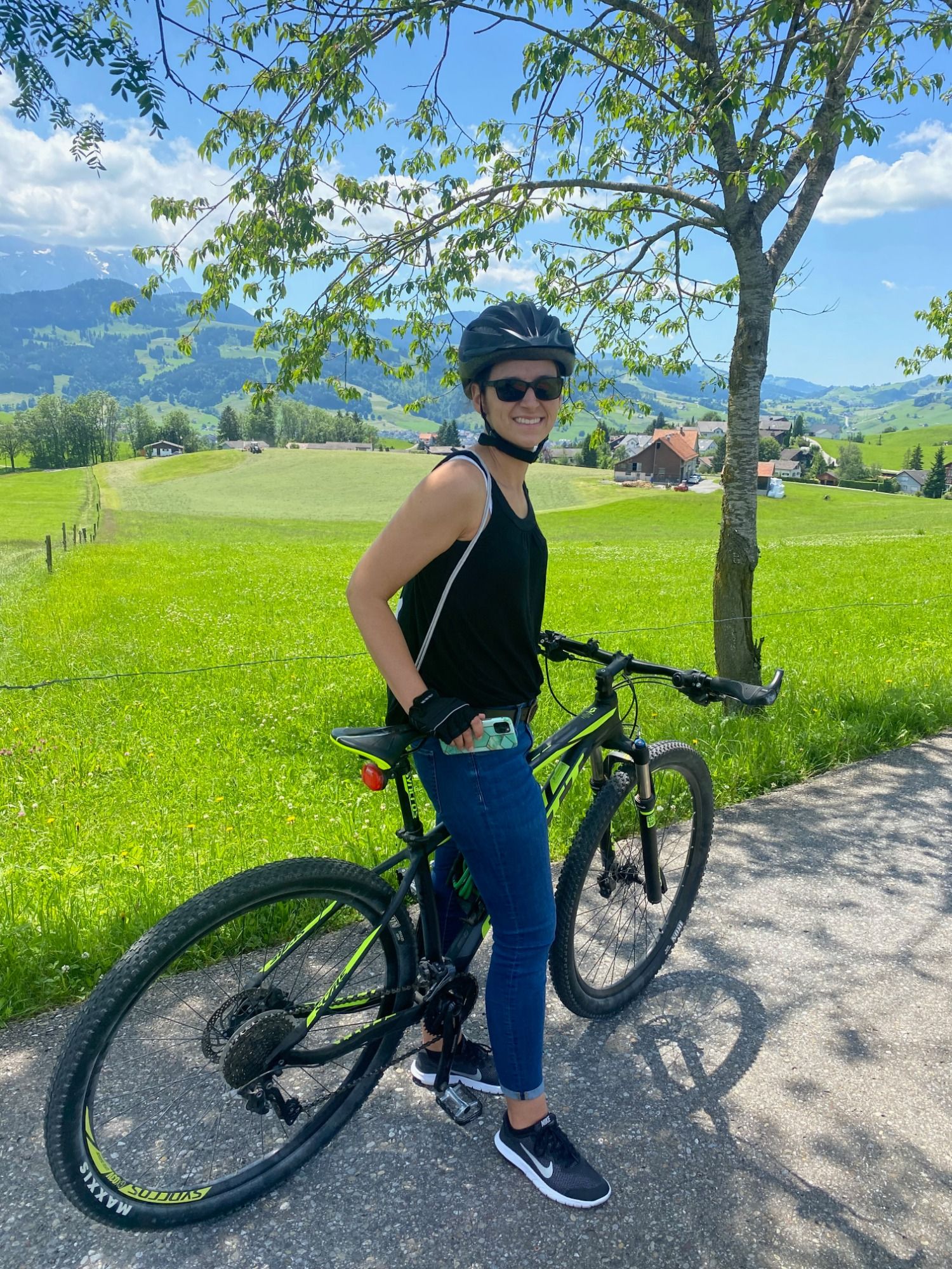 Nach kurzer Fahrt gelangen wir in den Kanton Appenzell, wo wir am ersten Parkplatz gleich eine tolle Aussicht genießen. Per Fahrrad geht es dann runter in den Ort Appenzell um die bunt bemalten Gebäude zu bestaunen. Zufällig entdecken wir auch noch einen passenden Stellplatz für die Nacht. Vorher strampeln wir aber erst mal den Berg wieder hinauf, bevor wir unseren Camper zum Schlafplatz bringen.