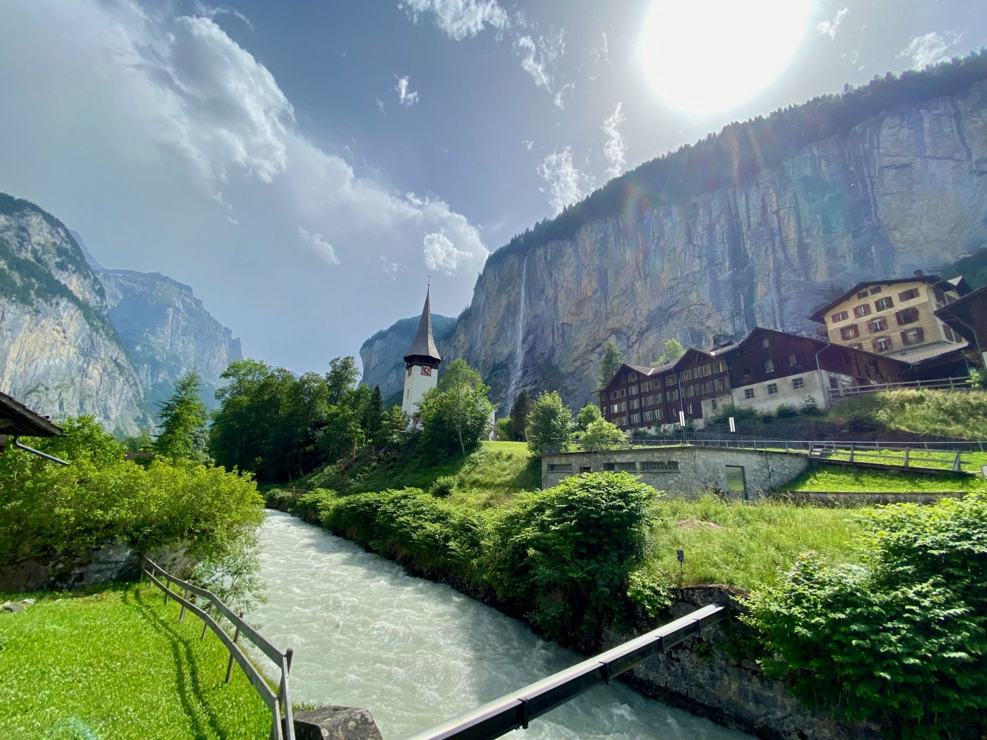 Dem berühmten Lauterbrunnental statten wir natürlich auch einen Besuch ab. Das Tal der 72 Wasserfälle besticht vor allem durch den 297 Meter hohen Staubbachfall. Hinter diesen Wasserfall kann man sogar über einen nassen, rutschigen Pfad gelangen und von dort oben hat man eine schönen Blick über das Tal.