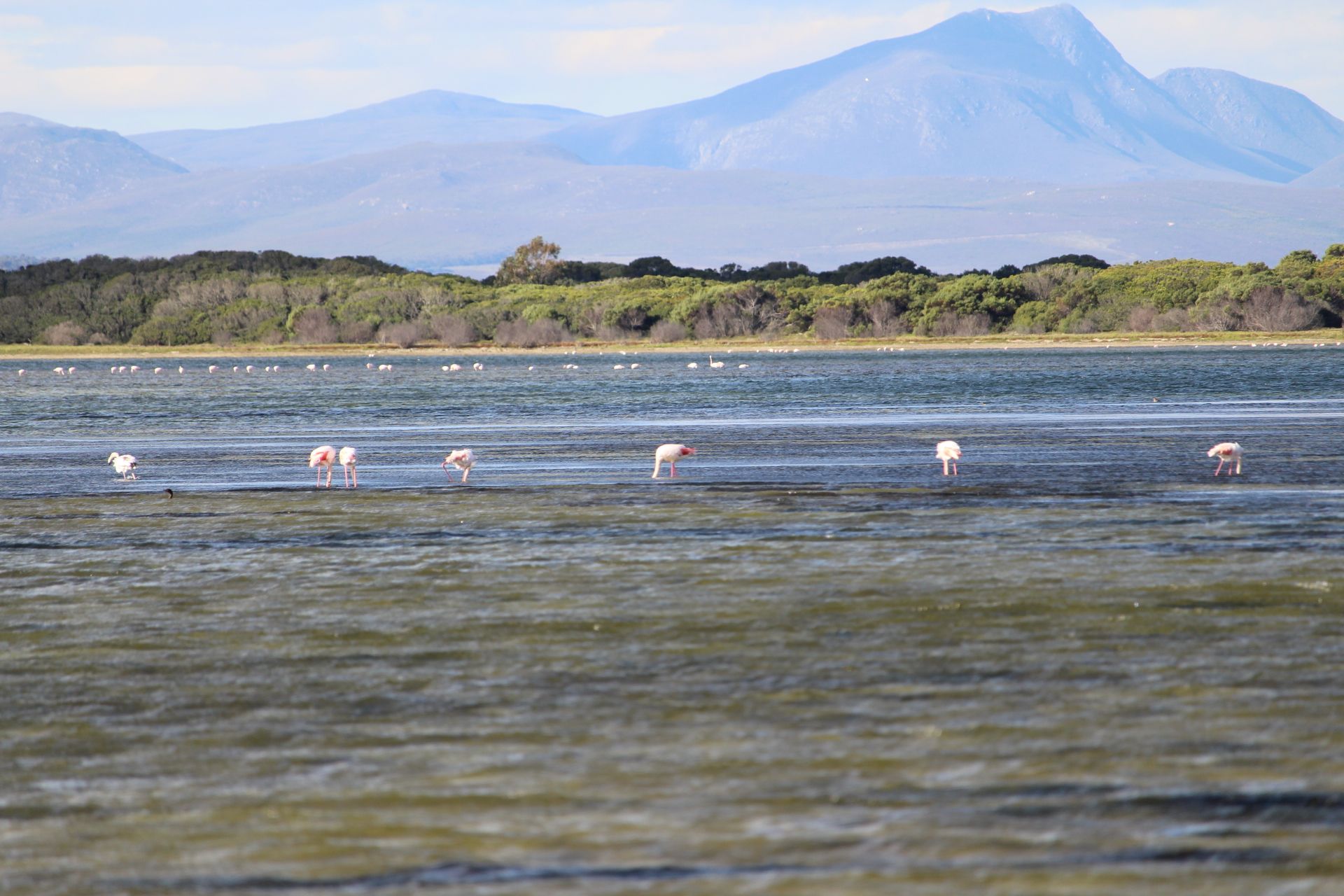 Unser vorletzter Übernachtungsplatz ist in Hermanus, der Wal-Hauptstadt Südafrikas. Durch die steil abfallenden Klippen im Meer kommen Wale auf der Futtersuche sehr nah ans Ufer heran und man kann die Meeressäuger schon direkt vom Hafen aus entdecken. Bei einem Spaziergang über den insgesamt über zehn Kilometer langen Cliff Path sind neben verschiedenen Walarten auch Robben und Dassies von den Klippen aus zu bewundern. Neben den spritzenden Wasserfontänen der Wale beeindruckt uns auch die riesige Delfinschule mit über hundert Tieren, die plötzlich durch die ganze Bucht springen. Im Osten der Küstenstadt liegt Grotto Beach, wo auch noch Flamingos zu finden sind.