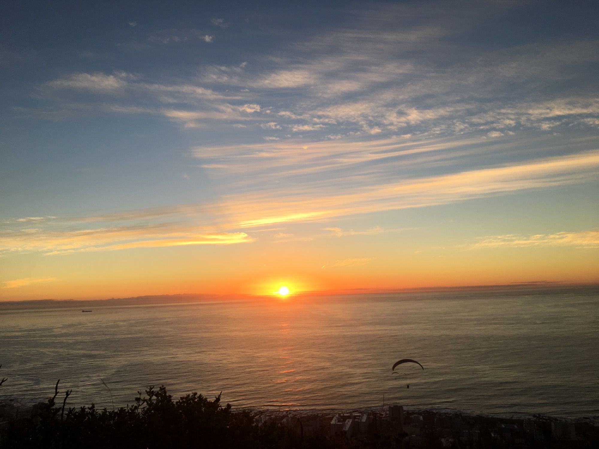 Den Tagesabschluss genießen wir am Signal Hill, dem kleinen Bruder des Tafelbergs. Wir beobachten den farbenfrohen Sonnenuntergang über dem Meer während immer wieder Gleitschirmflieger durch unser Blickfeld schweben. Die Rund-um-Sicht auf Kapstadt, den Tafelberg, den Lions Head und das Meer ist einfach atemberaubend.
