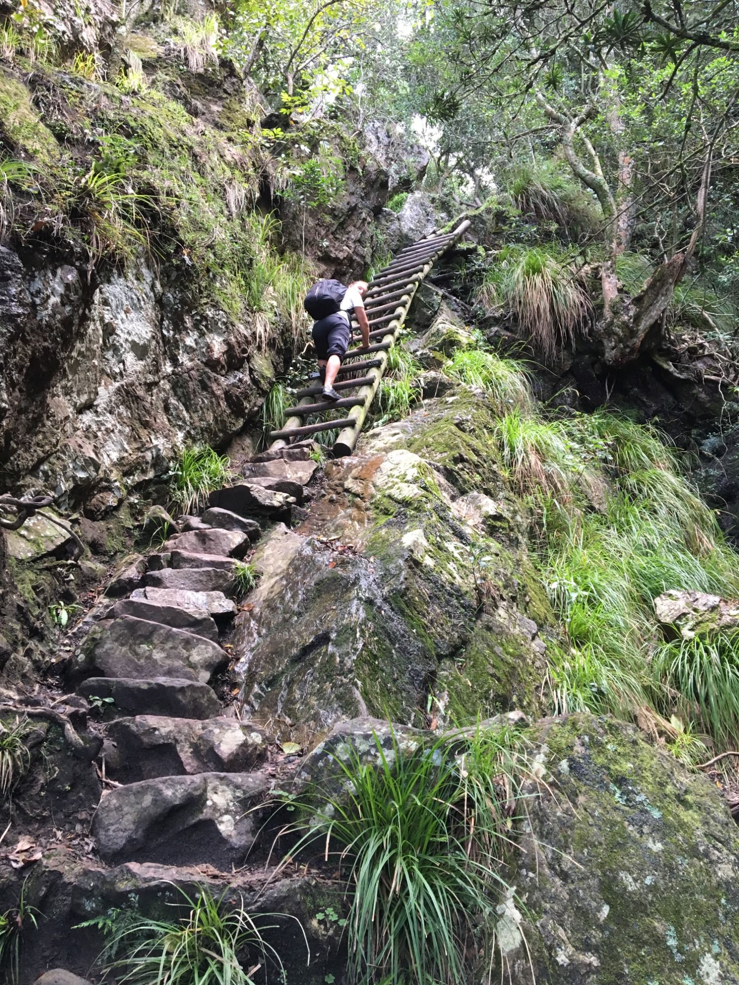 Den Tafelberg hat man nur wirklich erlebt, wenn man ihn selbst besteigt. An diese Weisheit halten wir uns natürlich und so erklimmen wir diesen eindrucksvollen Berg Meter um Meter: Stufen, Stufen, Stufen, Leitern, Stufen und dann ziehen auch noch Wolken auf. Nach 940 Höhenmetern kommen wir am höchsten Punkt an: Maclears Beacon. Über das flache Plateau laufen wir eine weitere Stunde über das Wahrzeichen Kapstadts zur Seilbahn am nördlichen Rand. Hier reißt auch die Nebeldecke auf und vor uns erstreckt sich das fantastische Panorama über Kapstadt, Robben Island, Signal Hill usw.